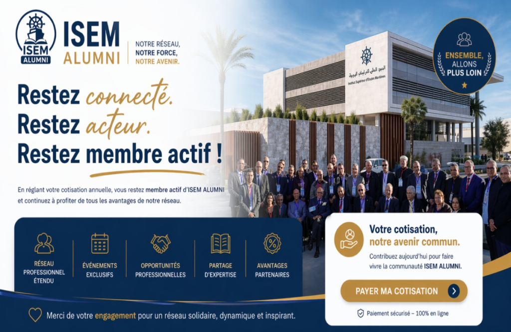Rejoindre ISEM ALUMNI, c’est rester lié à un réseau de lauréats partageant une même formation et une culture professionnelle commune. L’association permet de maintenir des liens durables, de favoriser les échanges entre générations et de participer à une dynamique collective utile aux lauréats et au secteur maritime.